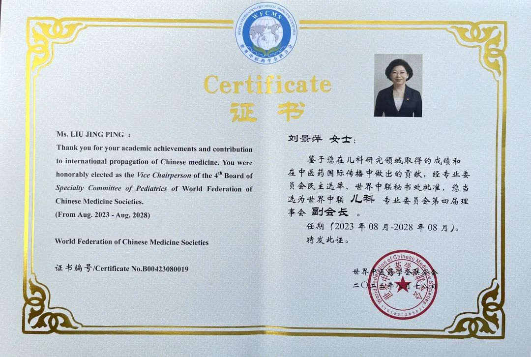 z6mg·人生就是博药业集团党委书记、董事长刘景萍当选世界中医药学会联合会儿科专业委员会第四届理事会副会长